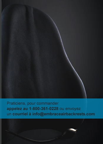 Un tissu blessé de la colonne a dramatiquement une moindre capacité à supporter un poids et du stress. Beaucoup de nos clients vont conduire pendant environ 10-20 minutes pour se rendre à la clinique. Être assis dans leur véhicule pendant toute cette période de temps augmente la flexion, causant ainsi une cyphose lombaire, et utilisant essentiellement les capacités de leurs tissus avant même qu'ils ne commencent leur traitement. L'utilisation du EmbraceAIRPlus leur permet de maintenir et de supporter confortablement leur lordose naturelle. Ils arriveront à votre clinique avec une capacité totale de traitement; vous réussirez mieux dans leur réhabilitation; ils seront reconnaissants que vous leur ayez fourni un produit de support du dos qui fonctionne! En fait, nos produits sont prouvés de fournir un taux de recommandation de plus de 23% grace à la satisfaction grandissante des clients.